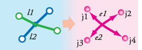In diesem Fall werden zwei Polylinien, die sich an einem gemeinsamen Stützpunkt überschneiden, in vier Kanten mit einem Knoten an dem Stützpunkt geteilt. Die Kanten e1 und e3 werden mit der Quell-Feature-Class und Objekt-ID des Linien-Features l1 gekennzeichnet. Die Kanten e2 und e4 werden mit der Quell-Feature-Class und Objekt-ID des Linien-Features l2 gekennzeichnet. Knoten j3 ist ein neu erstellter Systemknoten. Knoten j1, j2, j4 und j5 sind entweder Systemknoten oder Knoten aus lagegleichen Punkten aus einer Quell-Feature-Class.