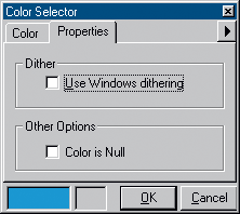 The ColorSelector is a dialog box that can be used to create new color objects. The dialog presents slider bars and check boxes that can be used to precisely set the properties of the new color.